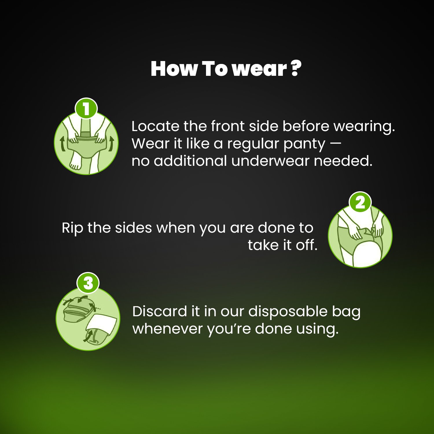 Wear like regular underwear. Ensure proper fit for protection. After use, tear from the sides to remove. Dispose responsibly in a bin.