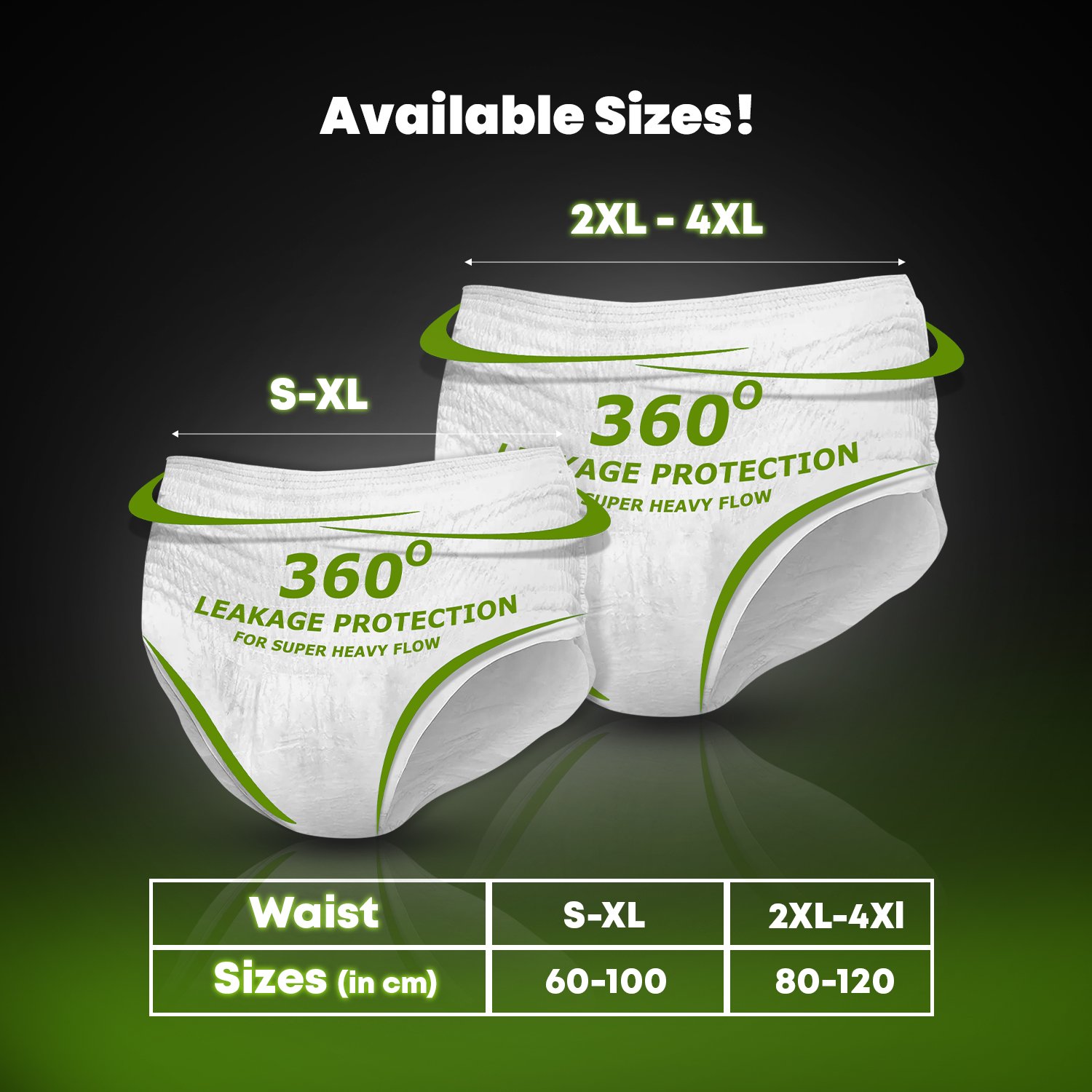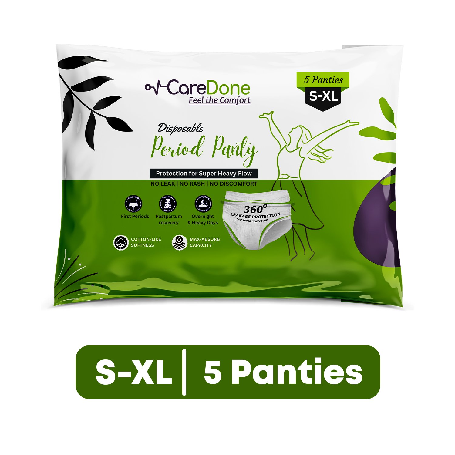 Leak proof overnight protection. High absorbency for heavy flow. 360 degree full coverage design. Soft and breathable material. Rash free comfortable wear. Secure fit that adapts to body shape.
